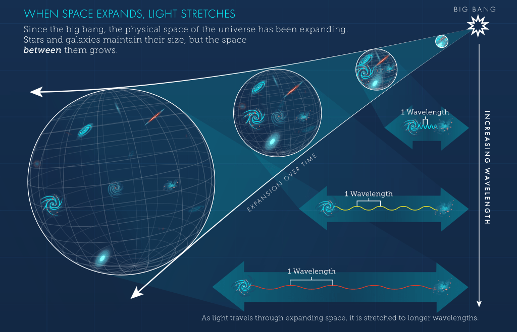 As mentioned above, Hubble’s discovery consists in the redshifts of the light emitted by remote galaxies, which depend on their distance from us. As space expands, the wavelength of electromagnetic radiation (or light in this case) travelling through this space also expands and becomes greater, thus shifting it towards the longer wavelengths. Importantly, such a phenomenon of a redshift is not accidental or limited to any local region; it is uniform across the entire observable universe. Therefore, it is not some sort of coincidence or regional phenomenon that happens only in our immediate vicinity.