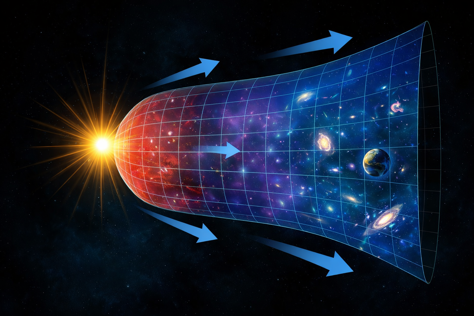 The expansion of the universe is considered to be one of the greatest and most well-supported facts of observational cosmology. We can observe that the farther away galaxies are from Earth, the greater is their redshift of the emitted light, which means that these galaxies recede from us. This is formulated by Hubble’s law, which describes that the velocity at which a galaxy recedes from us is directly proportional to the distance to that galaxy. However, Hubble’s law should not be understood as galaxies actually moving in this manner through space; space-time itself is expanding, which is the reason why this process does not violate any postulates of special relativity. In particular, even galaxies can recede from us faster than the speed of light, since special relativity postulates that an object cannot travel in space faster than this speed – it does not affect the rate at which space itself can expand. Such expansion is caused by dark energy.